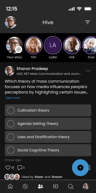 Community-driven social feed with posts, stories, and polls to foster collaborative learning