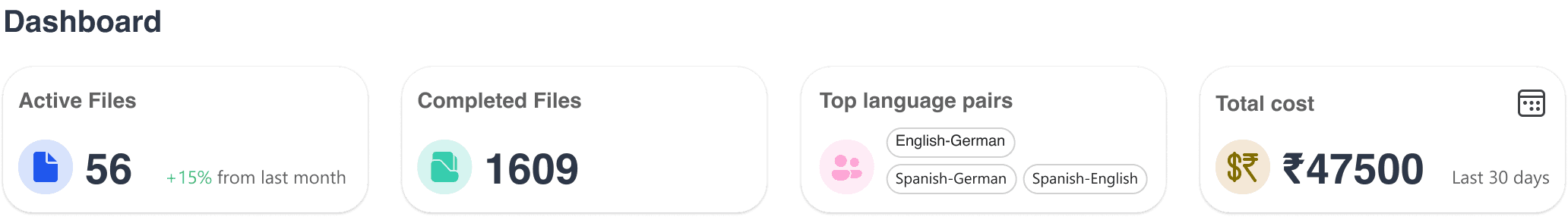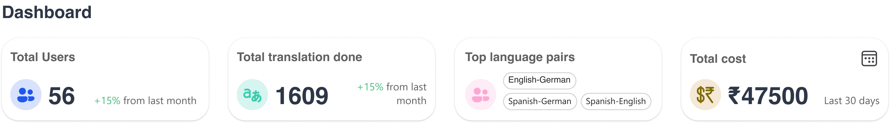 ✅Introduced centralized dashboard showing total translations, top language pairs, and costs.