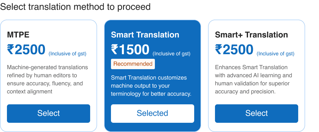 The translation method differentiation (Machine / Human / Smart) was redesigned to be scannable. Does the new framing actually reduce decision hesitation, or do users still need more guidance before selecting?